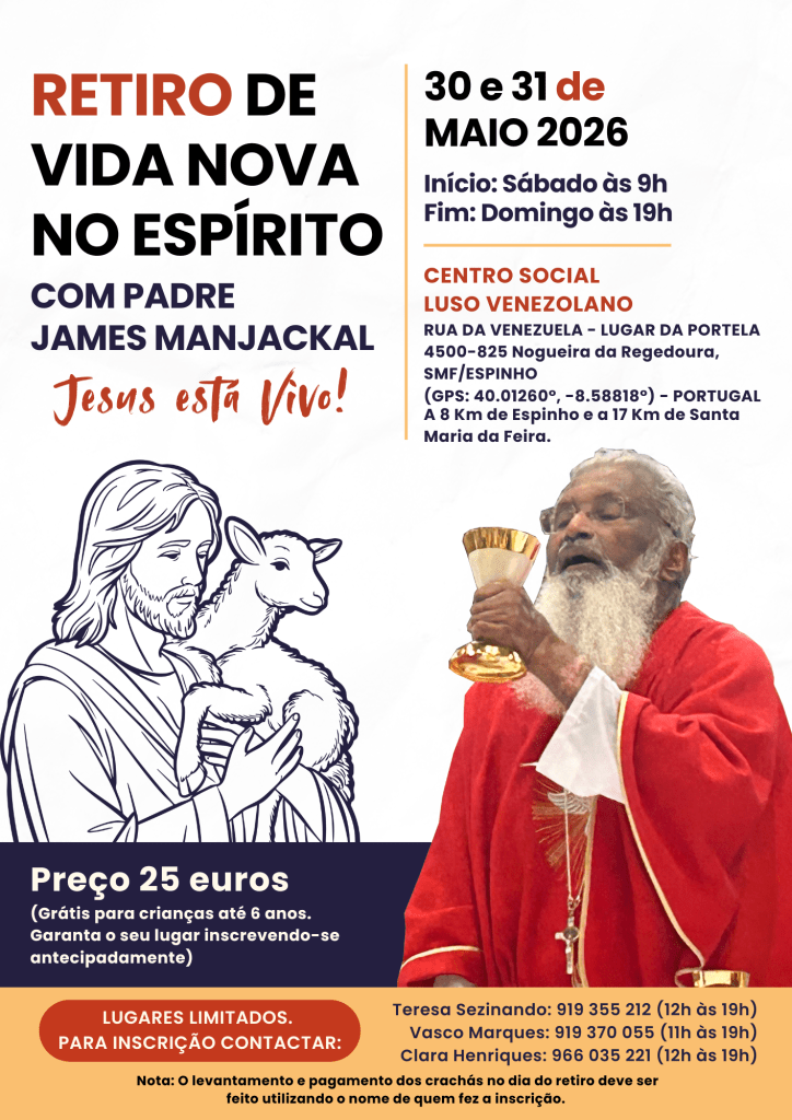 Padre James Manjackal (MSFS – Missionários de São Francisco de Sales) é um sacerdote Católico estigmatizado e comemorou o ano passado o seu Jubileu Sacerdotal (1973-2023). Em 1989 fundou o “Charis Bhavan” famoso Centro Carismático de retiros em Kerala, India. É também o fundador do “Charis Marien Maids”, uma comunidade apostólica de mulheres solteiras consagradas a Jesus, da Diocese de Vijayapuram, Kottayam, Kerala, India. Foi nomeado “Missionário da Misericórdia” pelo Papa Francisco em 10 de Fevereiro de 2016. De 8 a 11 de Abril 2018 esteve em retiro no Vaticano com o Papa Francisco, Cardeal Sarah, Bispo Joseph Clemens, Arcebispo Arthur Roche, Arcebispo Rino Fisichella, e Arcebispo Octavio Ruiz Arenas onde renovou com mais de 500 sacerdotes a sua missão perpétua de “Missionário da Misericórdia”. Pregou até hoje retiros em 104 países dos 5 continentes, para sacerdotes, religiosas, e leigos. Volta a Portugal onde pregou 44 retiros. https://www.jmanjackal.net